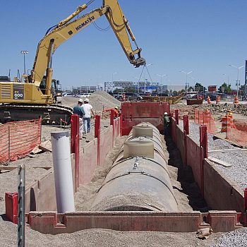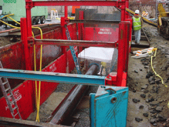 For example, in the picture, using a Komatsu PC 300, this double slide rail system, measuring 20’ deep x 10’ wide x 18’ long was installed in the middle of an active parking lot, allowing the crew to install an 8.5’ O.D. lift station.