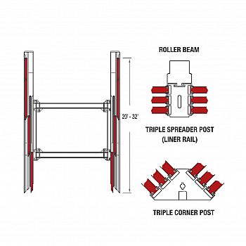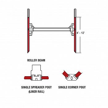 Available in Single (to be used with Single Spreader Post (a.k.a. Linear Rails), Double, Double Box Beam (to be used with the Double Spreader Post) and Triple. These roller beams attach to the inside face of the Slide Rail Spreader Post (a.k.a. Linear Rails), keeping these posts parallel and allowing vertical movement to accommodate maximum vertical clearance. All Slide Rail Roller Beams include heavy duty 4” diameter steel wheels with the industry’s only grease zerk fitting to easily grease the wheels, allowing them to effortlessly move up and down the Slide Rail Spreader Posts.